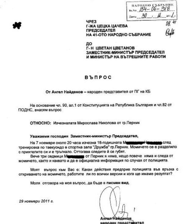 Какви действия предприе полицията във връзка с откриването на момичето, работи ли се по всички версии и кога ще имаме резултат? Такова питане чрез парламентарния контрол е отправил към вътрешния министър Цветан Цветанов народният представител Ангел Найденов на 30 ноември 2011г.