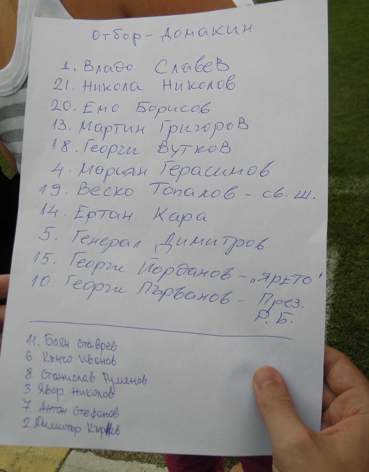 Публиката на мача не беше особено многобройна - на официалната трибуна седнаха няколкото съпруги на дипломати, първата дама Зорка, кметът на Перник Росица Янакиева и нейните заместници, председателят на Общинския съвет Добри Митрев и неговият заместник Хранимир Генчев, който от антикомунист и потомък на репресирани от режима на комунистите от известно време се превърна в горещ фен на Първанов, даже и на футболното поле. Местният соц. лидер Ненко Темелков, който получава заплата като заместник кмет на Перник, отговарящ за образованието и културата, беше дошъл със семейството си и роднини. На трибуната имаше и няколко активисти на социалистическата партия - главно такива, които са кандидати за кметове. По едно време дойде даже бившата шефка на ДАНС Весела Лечева с много силен тен от слънцето. Дамата, за която се говореше, че била интимно близка с Първанов и даже сега той се опитал да я пробута за вице на Калфин, седна близо да първата дама, но от другата страна на Янакиева. Сред официалните лица бяха и голяма група служители на президентството, както и охраната на първата дама и съпругите на дипломатите.