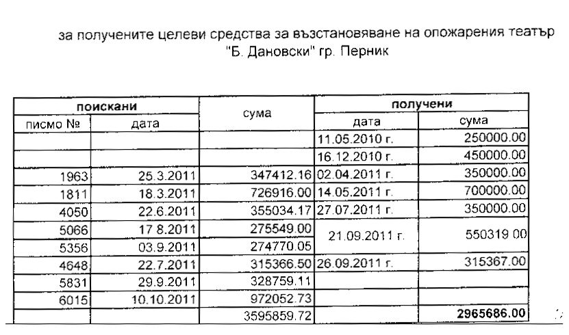Уважаеми народни представители, община Перник е получила значителна подкрепа от държавния бюджет за възстановяването на общинския драматичен театър. Целта е до края на м. ноември 2011 г. да се завърши реконструкцията на обекта и театърът в града отново да отвори врати. Благодаря за вниманието.