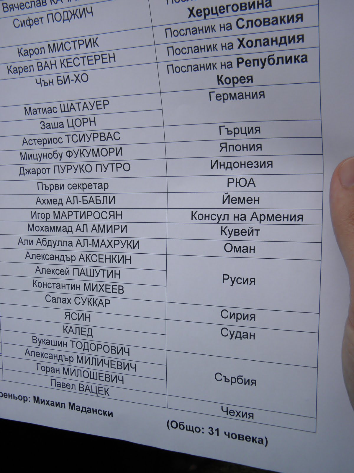 Публиката на мача не беше особено многобройна - на официалната трибуна седнаха няколкото съпруги на дипломати, първата дама Зорка, кметът на Перник Росица Янакиева и нейните заместници, председателят на Общинския съвет Добри Митрев и неговият заместник Хранимир Генчев, който от антикомунист и потомък на репресирани от режима на комунистите от известно време се превърна в горещ фен на Първанов, даже и на футболното поле. Местният соц. лидер Ненко Темелков, който получава заплата като заместник кмет на Перник, отговарящ за образованието и културата, беше дошъл със семейството си и роднини. На трибуната имаше и няколко активисти на социалистическата партия - главно такива, които са кандидати за кметове. По едно време дойде даже бившата шефка на ДАНС Весела Лечева с много силен тен от слънцето. Дамата, за която се говореше, че била интимно близка с Първанов и даже сега той се опитал да я пробута за вице на Калфин, седна близо да първата дама, но от другата страна на Янакиева. Сред официалните лица бяха и голяма група служители на президентството, както и охраната на първата дама и съпругите на дипломатите.